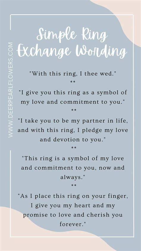 Bride, i give you this ring, which to me is a symbol of my love and commitment to you. I gladly accept this ring and will wear it always as a sign of my love for you. “i see these vows not as promises but as privileges: With this ring, i give you my heart.